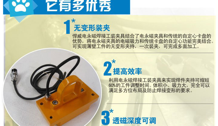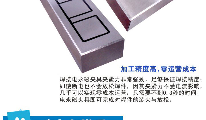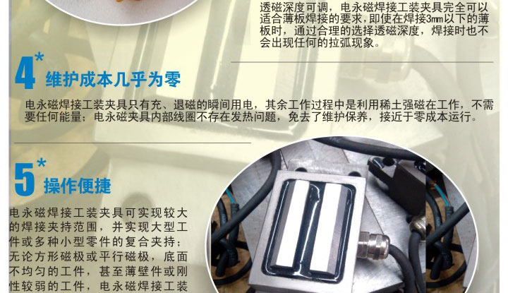 利用電永磁焊接工裝夾具來實現(xiàn)焊件夾持可縮短30%~50%的工件調(diào)整時間;簡單的按下按鈕,0.3秒的時間即完成工件的裝夾或釋放,大大提供了生產(chǎn)效率。電控永磁快速焊接夾具夾持技術(shù)可實現(xiàn)一次裝夾,五面加工,這保證了大型零件加工過程中可靠的工藝及減輕了夾具設(shè)計要求。透磁深度可調(diào):完全可以適合薄板焊接的要求,即使在焊接3mm以下的薄板時,通過合理的選擇透磁深度,焊接時也不會出現(xiàn)任何的拉弧現(xiàn)象。