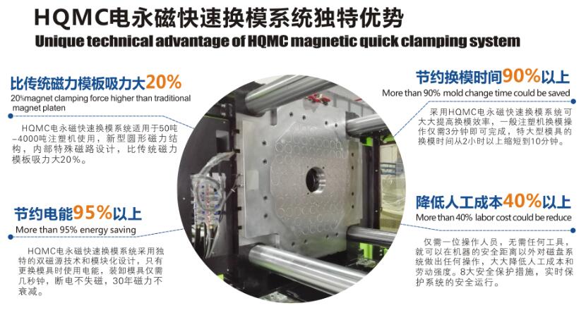 據(jù)了解,悍威磁電的這套新型系統(tǒng)由于內(nèi)部具有特殊磁路設(shè)計(jì),比傳統(tǒng)磁力模板的吸力大20%,能夠適用于50-4000噸注塑機(jī)使用,僅需一位操作員在機(jī)器安全距離以外即可對(duì)磁盤(pán)系統(tǒng)作出操作,且無(wú)需另外使用任何工具,大大降低了人工成本和勞動(dòng)強(qiáng)度。系統(tǒng)獨(dú)有的8大安全保護(hù)措施,更能實(shí)施保護(hù)安全運(yùn)行。除此之外,這套系統(tǒng)裝卸模具僅需幾秒鐘,吸力高達(dá)160N/cm2以上,大大提升了換模效率,而且完全拋棄了傳統(tǒng)壓板鎖模的固定方式,開(kāi)模不變形,能夠被廣泛適用于在機(jī)床、沖床、注塑機(jī)、壓鑄機(jī)等成型機(jī)械上固定模具。