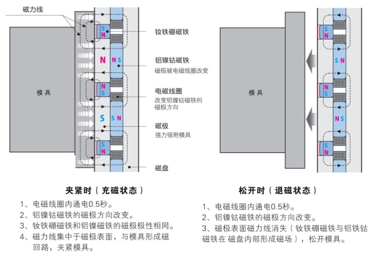 在換模的時(shí)候用夾膜板反復(fù)拆卸更換模具長(zhǎng)達(dá)4小時(shí),導(dǎo)致整個(gè)生產(chǎn)效益低下,增加了注塑機(jī)器的耗損。早在很久之前就有國(guó)外引進(jìn)的快速換模系統(tǒng)技術(shù),在國(guó)內(nèi)也有很多在快速換模系統(tǒng)技術(shù)中做得很好的生產(chǎn)廠家,株洲悍威磁電研發(fā)生產(chǎn)的注塑機(jī)快速換模系統(tǒng),電永磁快速換模系統(tǒng)采用國(guó)際先進(jìn)的磁路技術(shù)和脈沖放電技術(shù),用電控來(lái)改變永磁體的磁路分布,靠永磁體吸附模具,夾緊與放松過(guò)程只需幾秒鐘,工作過(guò)程中不需電能維持,每平方厘米的吸力達(dá)到160N以上,完全避免了傳統(tǒng)換模方式的諸多缺陷。